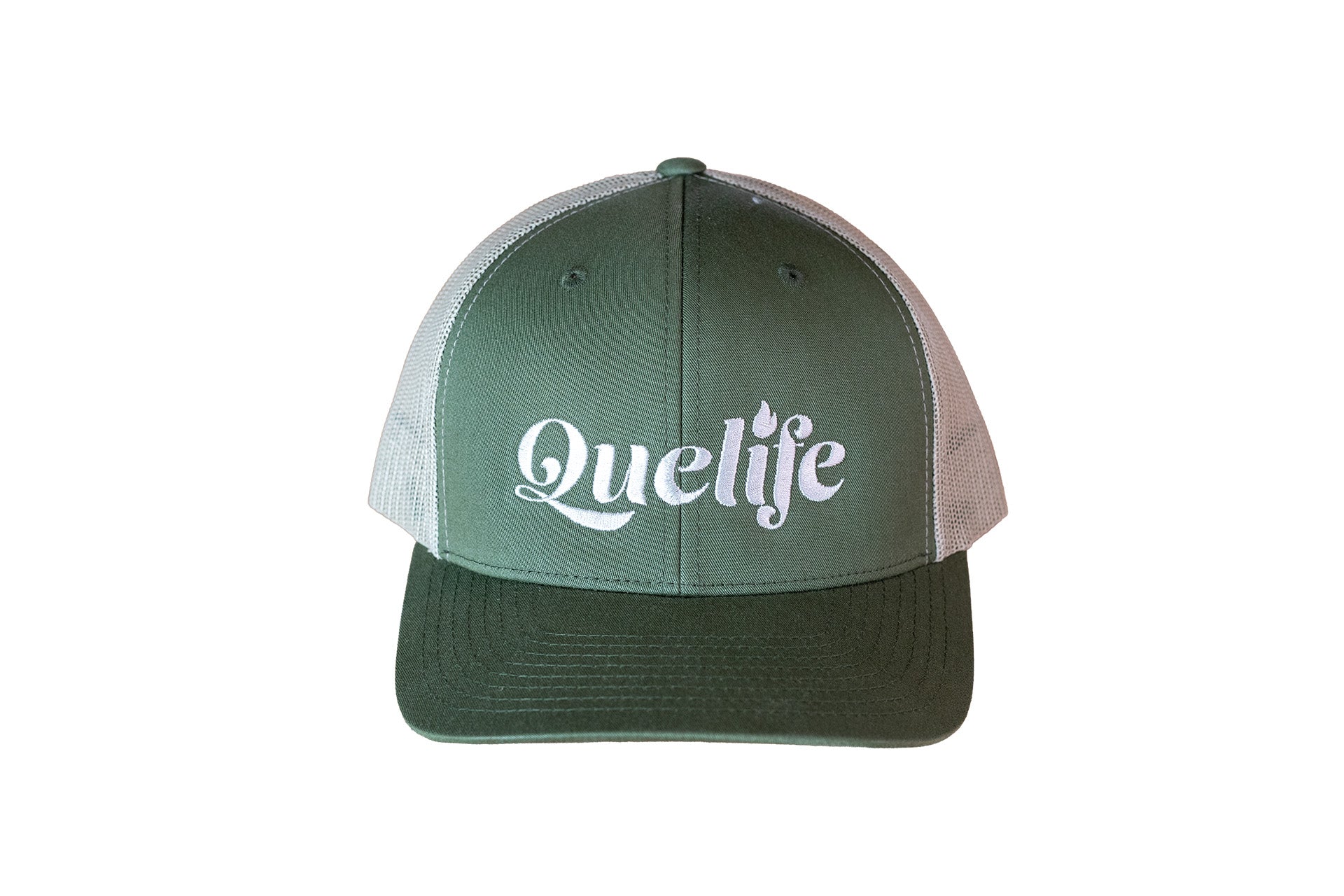 Green with Khaki mesh adjustable fit cap with "Que Life" on front in Cream Stitching
