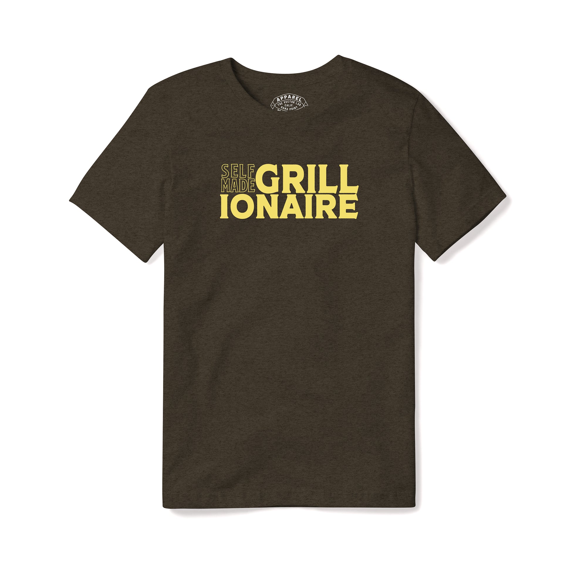 Are you a Self Made "Grillionare"? Get the shirt to prove it. Dark Brown Next Level tee with gold ink.