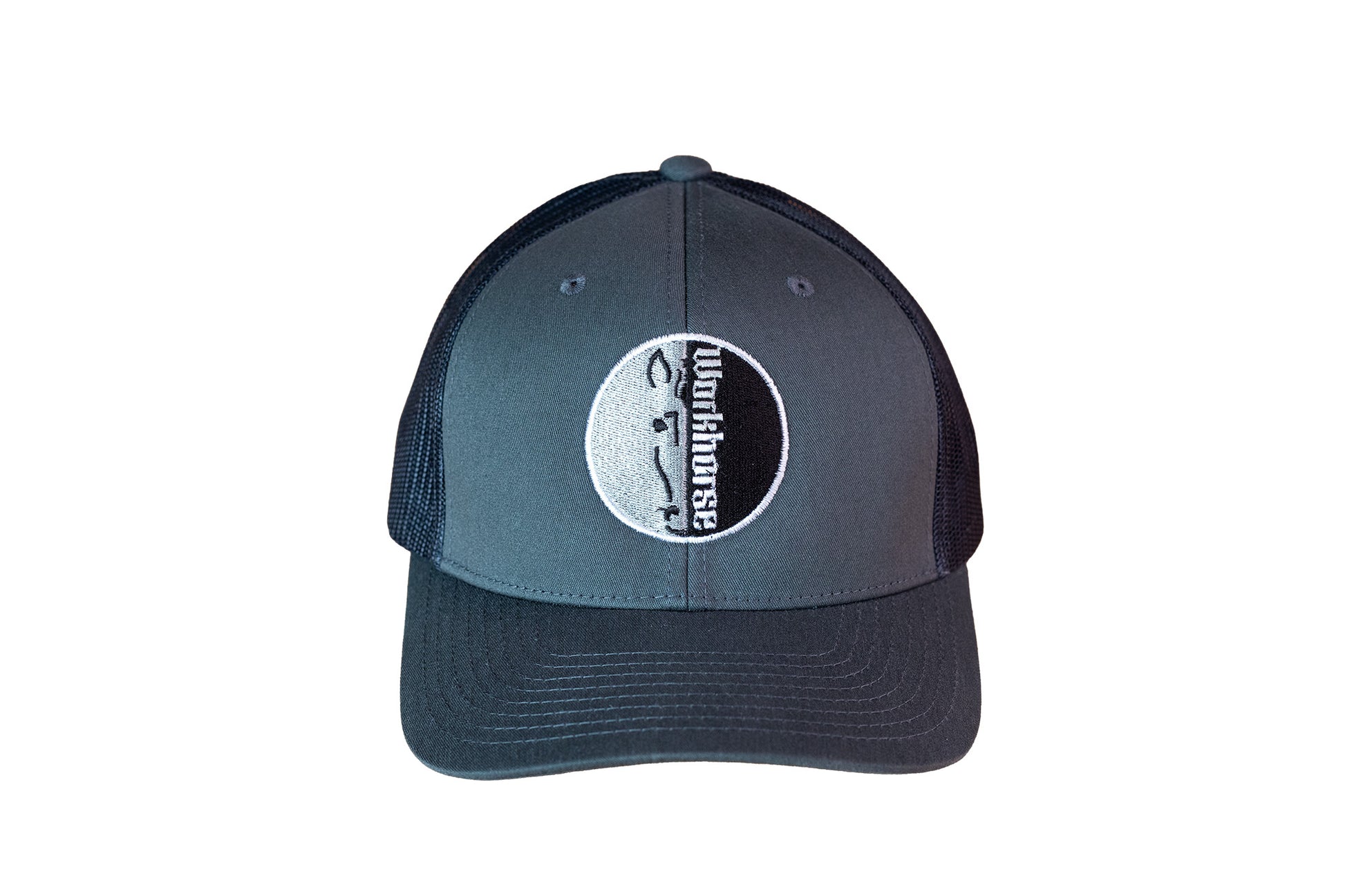 Charcoal grey 6-panel hat with charcoal grey mesh back and snapback closure, featuring Workhorse Pits logo.