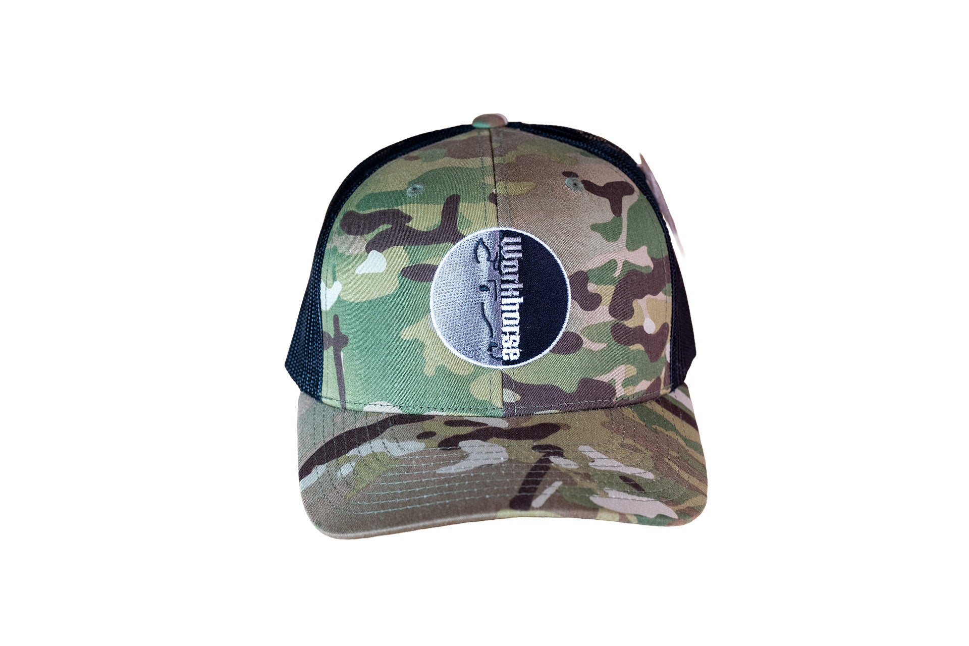 Multi-Cam hat with black mesh and the circular Workhorse Pits logo